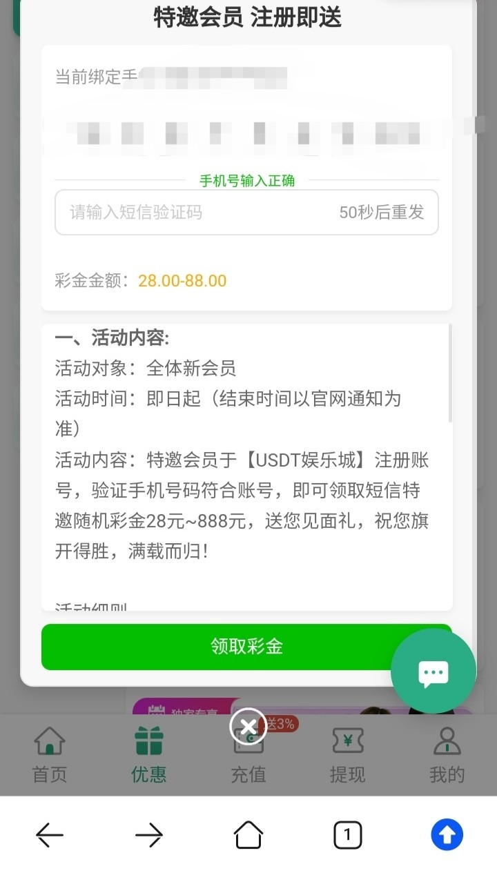 输入手机号看看是不是特邀,是特邀的话28-88,不是特邀可以联系客服申请注册彩金