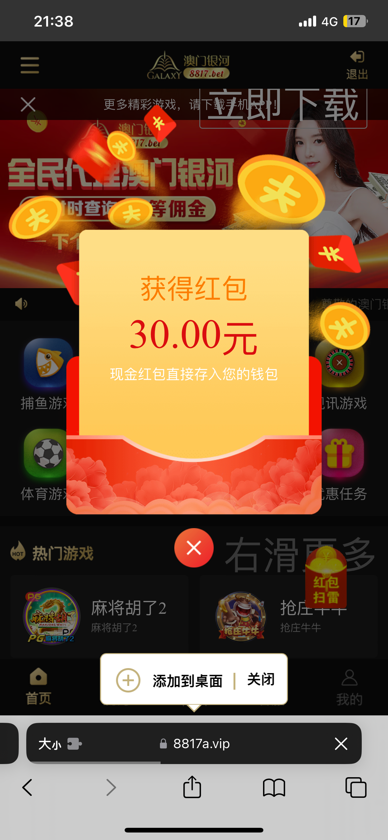 第一天送38,第二天登陆红包领30