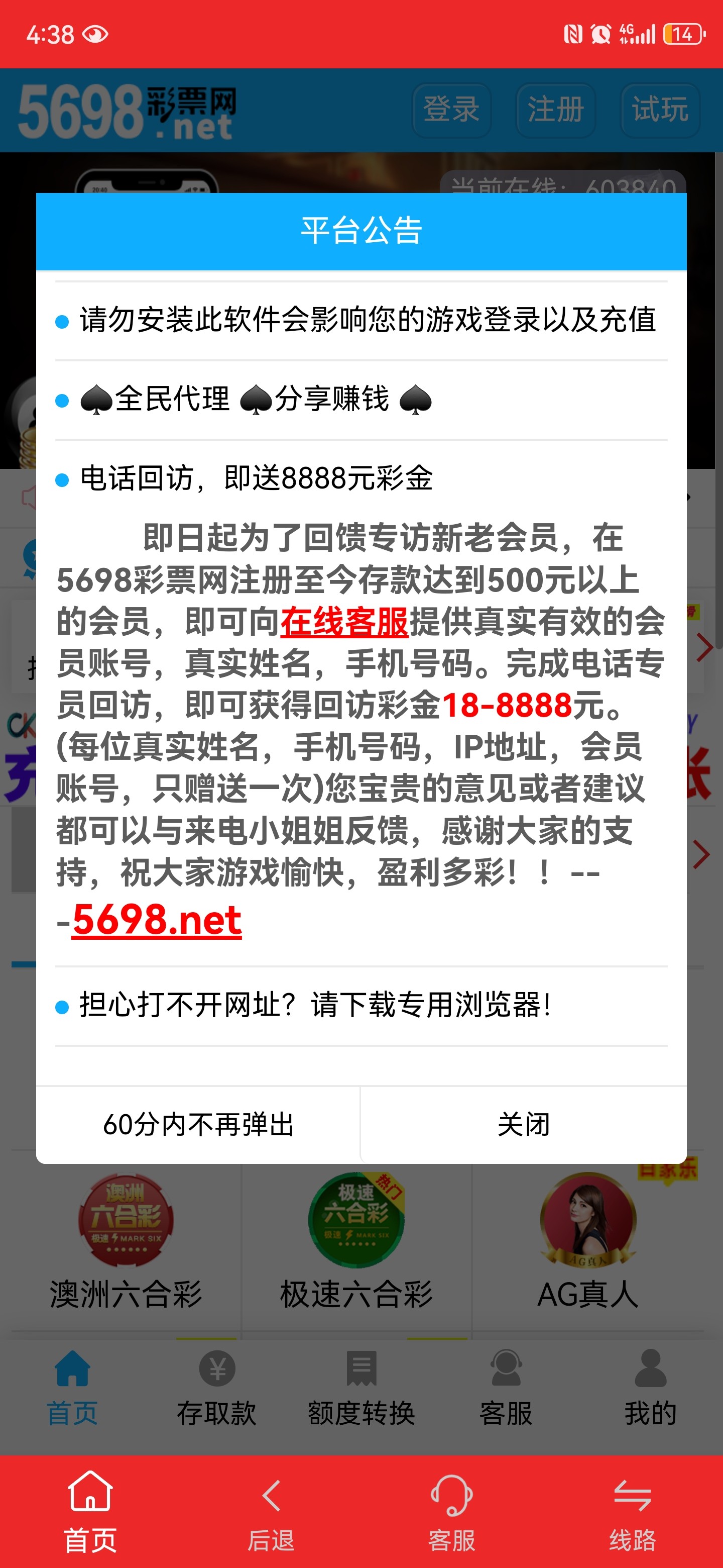5698.vip 客服申请电话回访彩金 充值过的应该都有 最低好像58