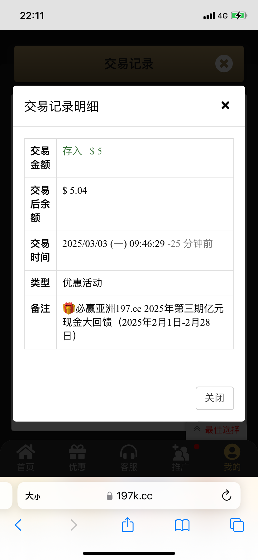 197这个台很杀,我都卸载了,别人说有现金回馈,应该是2月有存款的,有过存款的老哥去看下,反正是不在这个台存款了,5块回馈到50我就走了,我知道它后面肯定会吃掉,不如自己提了吃了