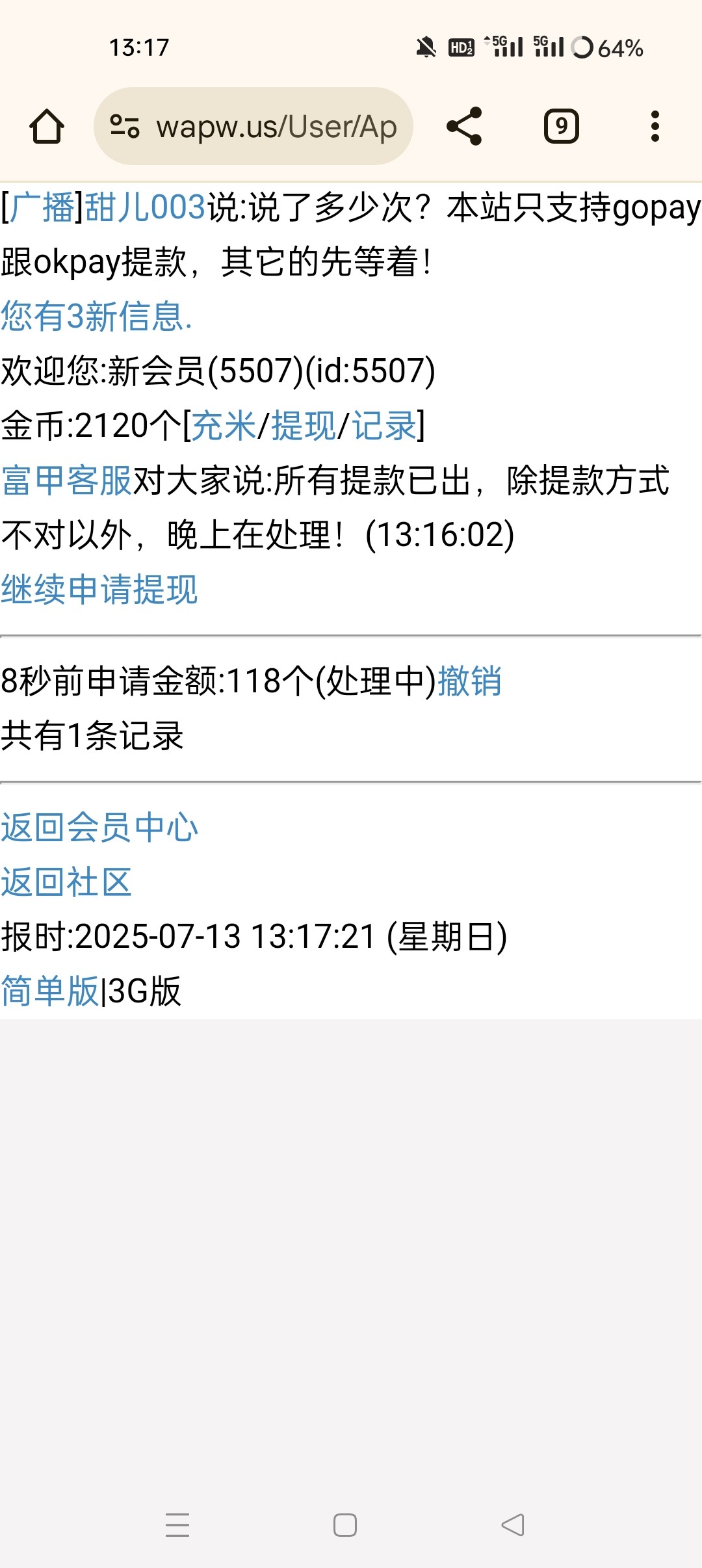 chz911014 刚开始绑银行卡不让提,只能提Ok和go,让清除提款方式等了半天最后找他们那个聊天的客服清除的,最后到账,是真想不到能到。