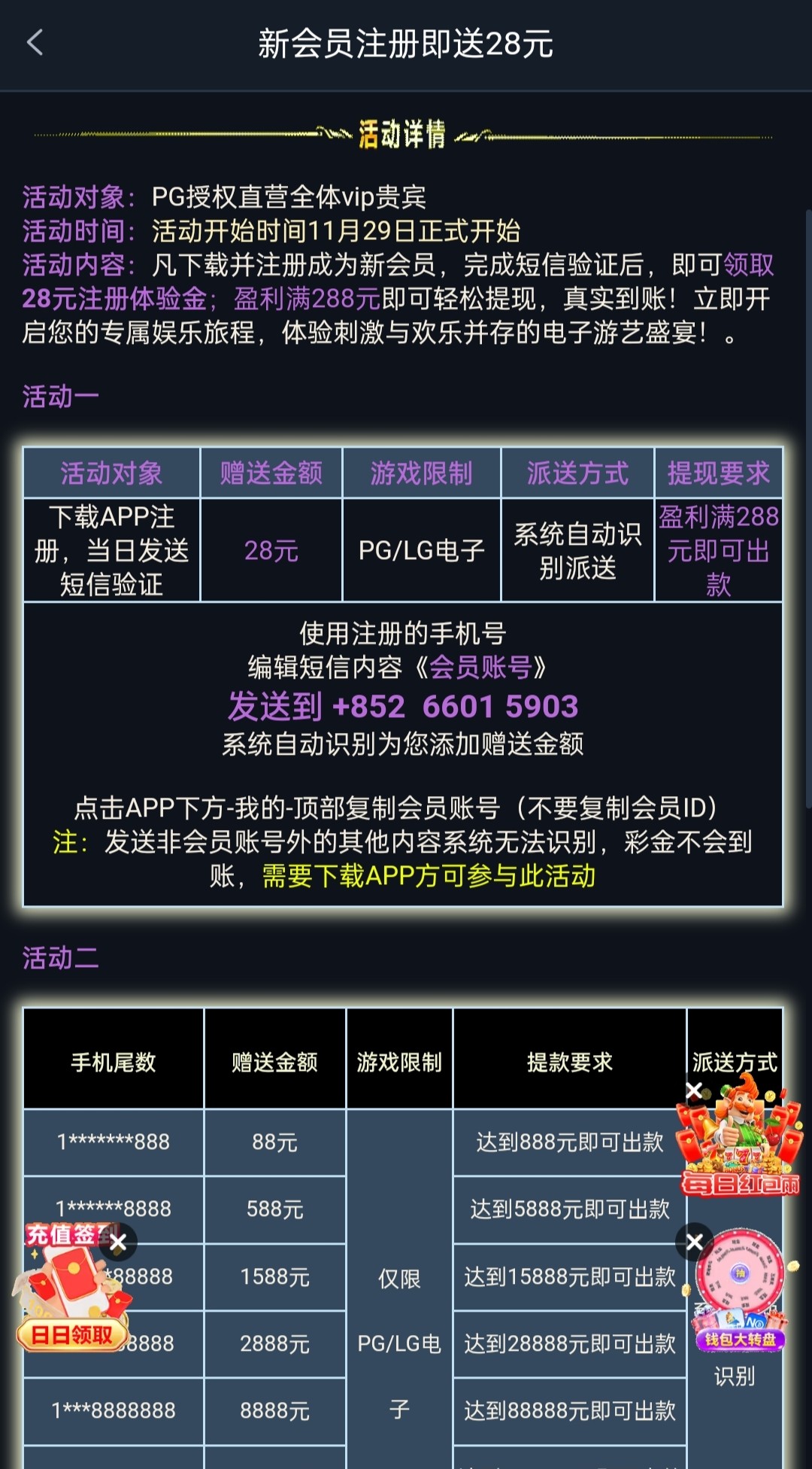 新用户注册下载APP绑定好信息发送短信送28彩金,具体自测吧