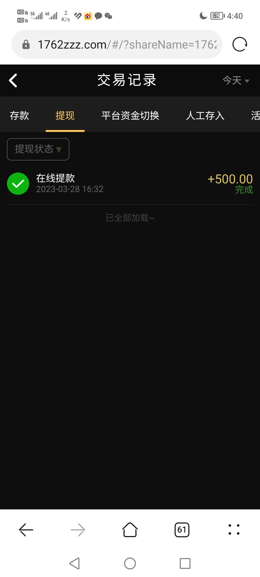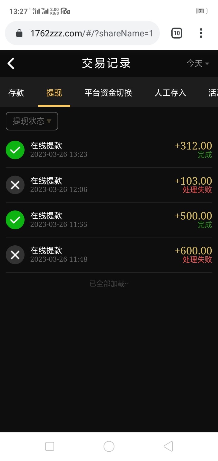 应该是只能提500  提600+拒绝了 提500秒了  多出来的余额他退回了  我又充值了50又提300  把前天9192黑款的钱打回来了